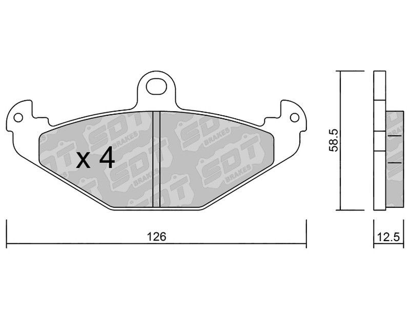 Pastillas de freno SDT RT1066 2592000RT de alta calidad, diseñadas para vehículos motorizados. Fabricadas con compuestos cerámicos y estructura metálica resistente, ofrecen una excelente eficacia de frenado y durabilidad. Ideales para conductores que buscan rendimiento y seguridad. Dimensiones precisas: 126 mm de ancho, 58.5 mm de alto y 12.5 mm de