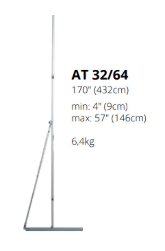 Patas At-Legs Monoblox32/64 para pantallas de proyección, fabricadas en metal resistente y con ajuste de altura desde 9 cm hasta 146 cm. Ideal para instalaciones profesionales o domésticas, ofrece estabilidad y facilidad de montaje. Peso ligero de 6,4 kg y altura total de 432 cm. Perfectas para soportar pantallas grandes con seguridad y precisión.