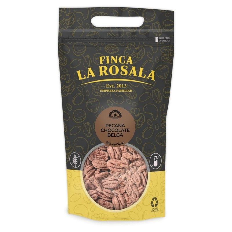 Pecanas cubiertas con chocolate negro belga al 60% de cacao, en bolsa de 500 grs de la marca Finca La Rosala. Ideal para amantes de frutos secos gourmet y chocolate de alta calidad. Producto de empresa familiar desde 2013, con un diseño elegante y ventana transparente que muestra el contenido. Perfecto para disfrutar como snack saludable o regalo e