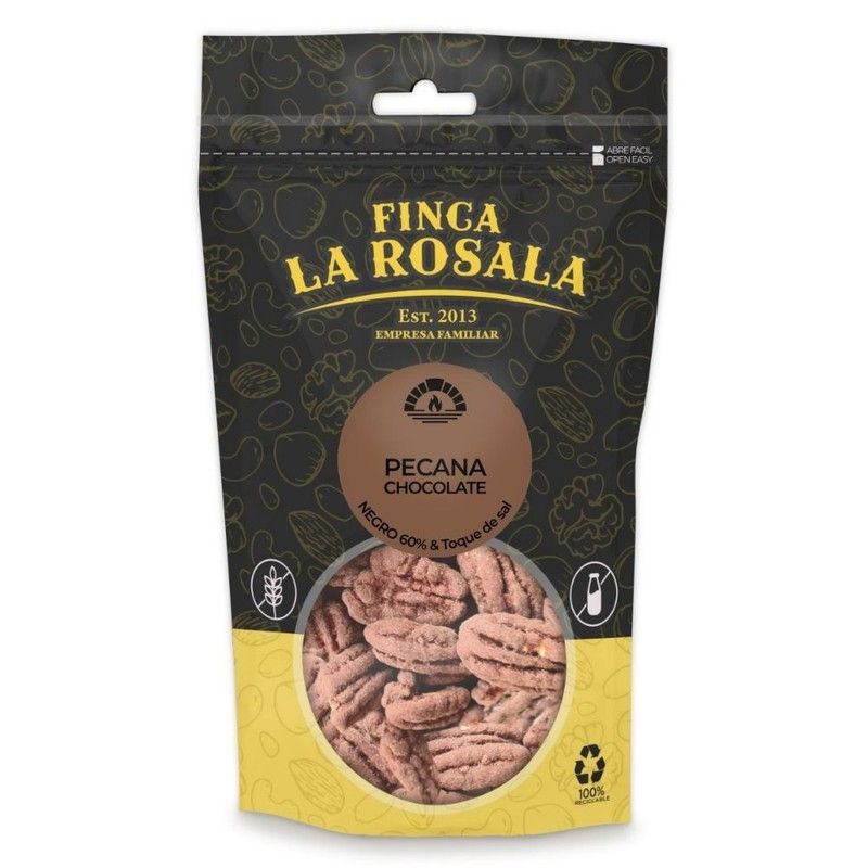 Pecanas cubiertas con chocolate negro 60% en bolsa de 80 grs de Finca La Rosala, una empresa familiar desde 2013. Ideal para amantes de frutos secos gourmet, con textura crujiente y sabor intenso. Perfecto como snack saludable, regalo o para disfrutar en cualquier momento del día. Embalaje con ventana transparente que muestra el contenido.