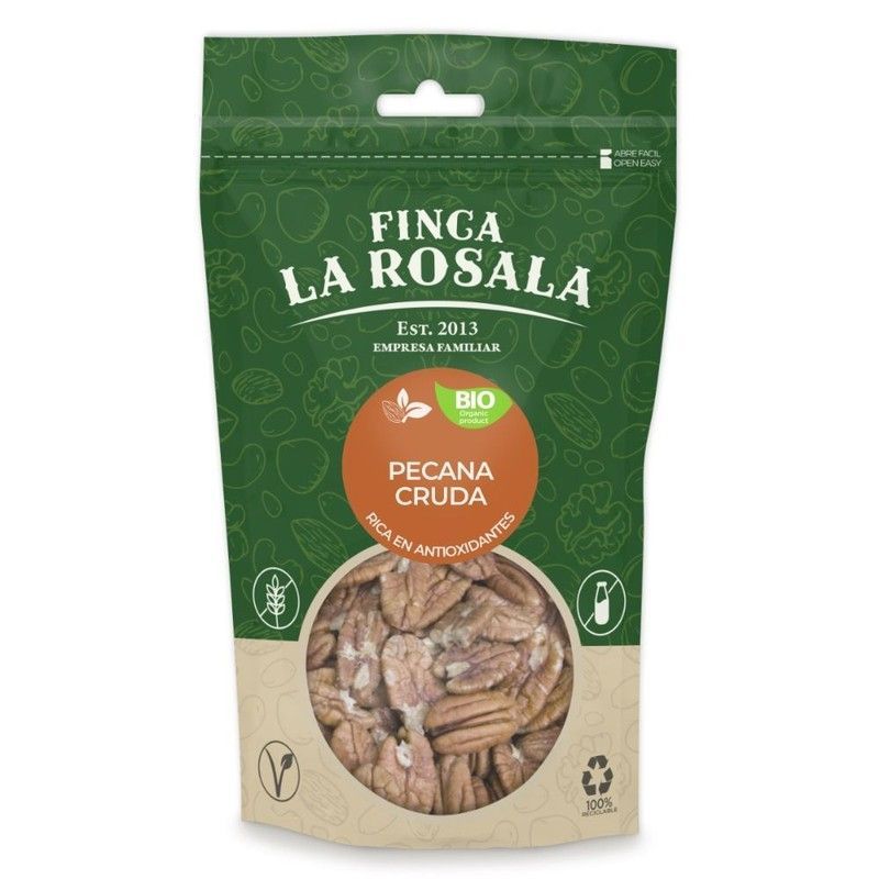 Pecanas crudas ecológicas de Finca La Rosala, en bolsa de 500 grs. Rico en antioxidantes y sin aditivos, ideal para snacks saludables, batidos o recetas gourmet. Producto de empresa familiar desde 2013, con certificación BIO. Embalaje con ventana transparente para ver el contenido natural y crujiente.