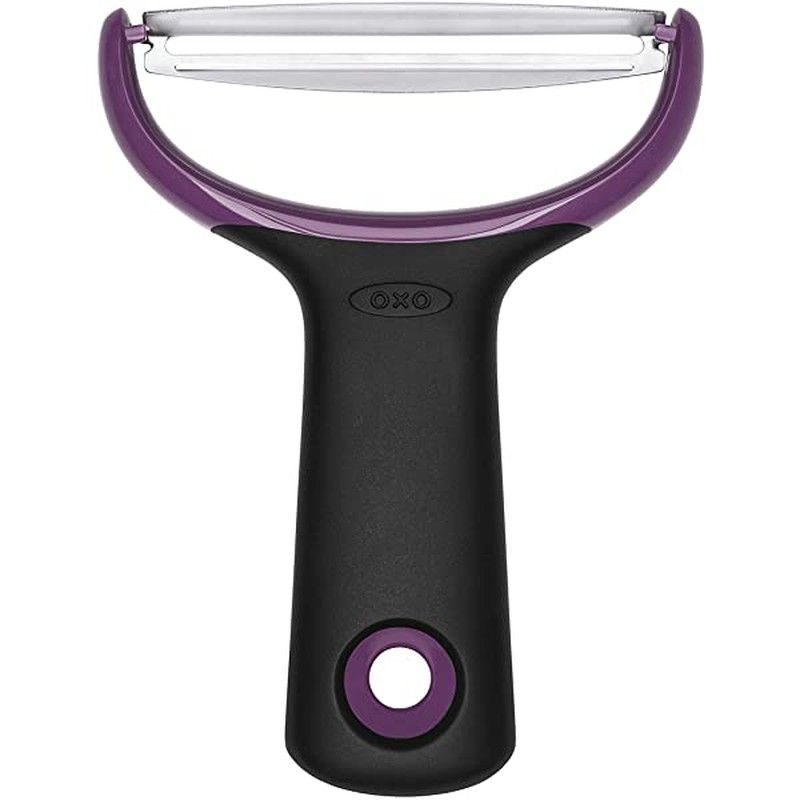 Pelador de alimentos OXO Good Grips con manija ergonómica en negro y detalles morados, fabricado con acero inoxidable y plástico de alta calidad. Ideal para pelar frutas y verduras con precisión y comodidad. Diseño antideslizante para un mejor control y seguridad en la cocina.