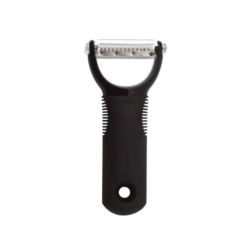 Pelador pendular juliana OXO Good Grips con manija de plástico negro antideslizante y cuchilla de acero inoxidable. Ideal para pelar y cortar verduras en juliana con precisión. Diseño ergonómico para un agarre cómodo y seguro. Perfecto para cocineros que buscan eficiencia y calidad en la cocina.