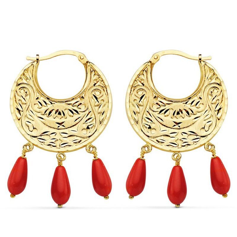 Elegantes pendientes aros en oro 18kts con diseño tallado y detalles florales, adornados con tres colgantes de coral rojo en forma de gota. Perfectos para looks sofisticados y ocasiones especiales, combinan la elegancia del metal dorado con el color vibrante del coral. Ideal para mujeres que buscan joyería de calidad y estilo clásico.