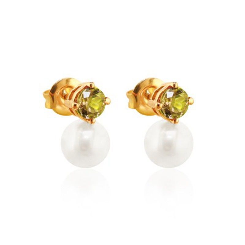 Pendientes de mujer elegantes y sofisticados con diseño Tu y Yo, en oro con perla cultivada blanca y piedra verde en forma de corazón. Ideales para looks formales o diarios, combinan elegancia y delicadeza. Perfectos como regalo o para completar tu joyería diaria.