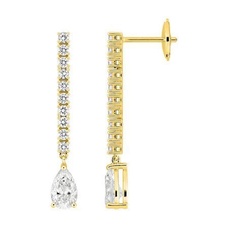 Elegantes pendientes de oro de 18 quilates con diamantes de laboratorio de 1,52 ct. Diseño vertical con cadena de diamantes y pieza inferior en forma de pera. Ideal para ocasiones especiales. Calidad premium y acabado brillante. Para mujeres que buscan sofisticación y lujo.