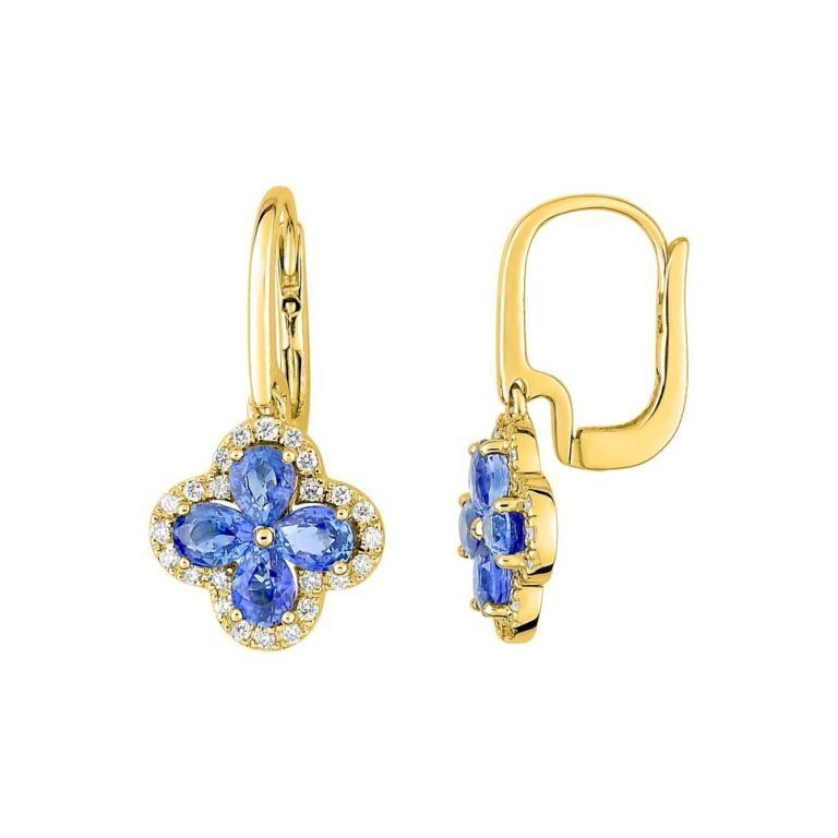 Elegantes pendientes Christian Bernard en oro de 18 quilates con diseño floral de cuatro pétalos, cada uno con un zafiro azul talla ovalada y contorno de diamantes de 0,20 ct. Perfectos para ocasiones especiales, combinan sofisticación y brillo. Ideal para mujeres que buscan joyería de lujo con detalles refinados.