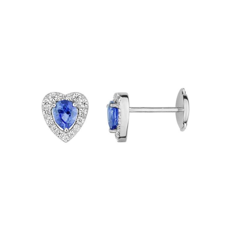 Pendientes de oro blanco 18k con zafiro azul en forma de corazón y diamantes incrustados, diseño elegante y sofisticado. Perfectos para mujeres que buscan joyas de alta calidad para ocasiones especiales. Combina lujo y delicadeza en cada detalle.