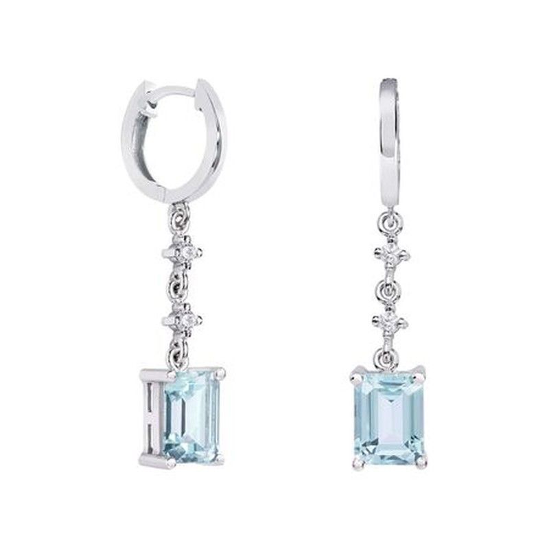 Elegantes pendientes colgantes en oro blanco de 18kts con topacios azules de corte rectangular y detalles de diamantes. Diseño sofisticado y brillante, perfectos para ocasiones especiales o looks formales. Ideal para mujeres que buscan joyería de alta calidad con un toque de elegancia y distinción.