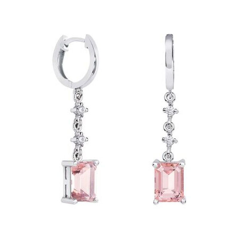 Elegantes pendientes colgantes en oro blanco de 18kts con topacios rosa de corte rectangular y detalles de diamantes. Diseño sofisticado y femenino, perfectos para ocasiones especiales o como complemento diario. Ideal para mujeres que buscan joyería de alta calidad con un toque de elegancia y brillo.