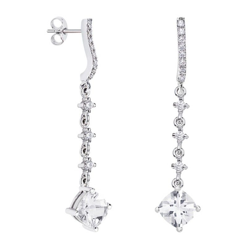 Elegantes pendientes colgantes en oro blanco de 18kts con corte rombo de 7x7mm, incrustados con topacios blancos y diamantes. Diseño sofisticado y delicado, perfectos para mujeres que buscan un toque de lujo en sus looks formales o de noche. Ideal para bodas, eventos de gala o como regalo exclusivo.