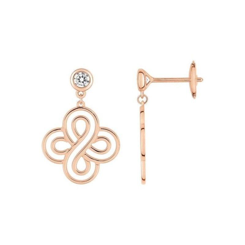 Elegantes pendientes colgantes en oro rosa de 18 quilates con diseño de nudo floral, adornados con un diamante de 0.20 ct de calidad GH SI. Perfectos para mujeres que buscan sofisticación y estilo. Ideal para ocasiones especiales o como complemento diario de lujo.