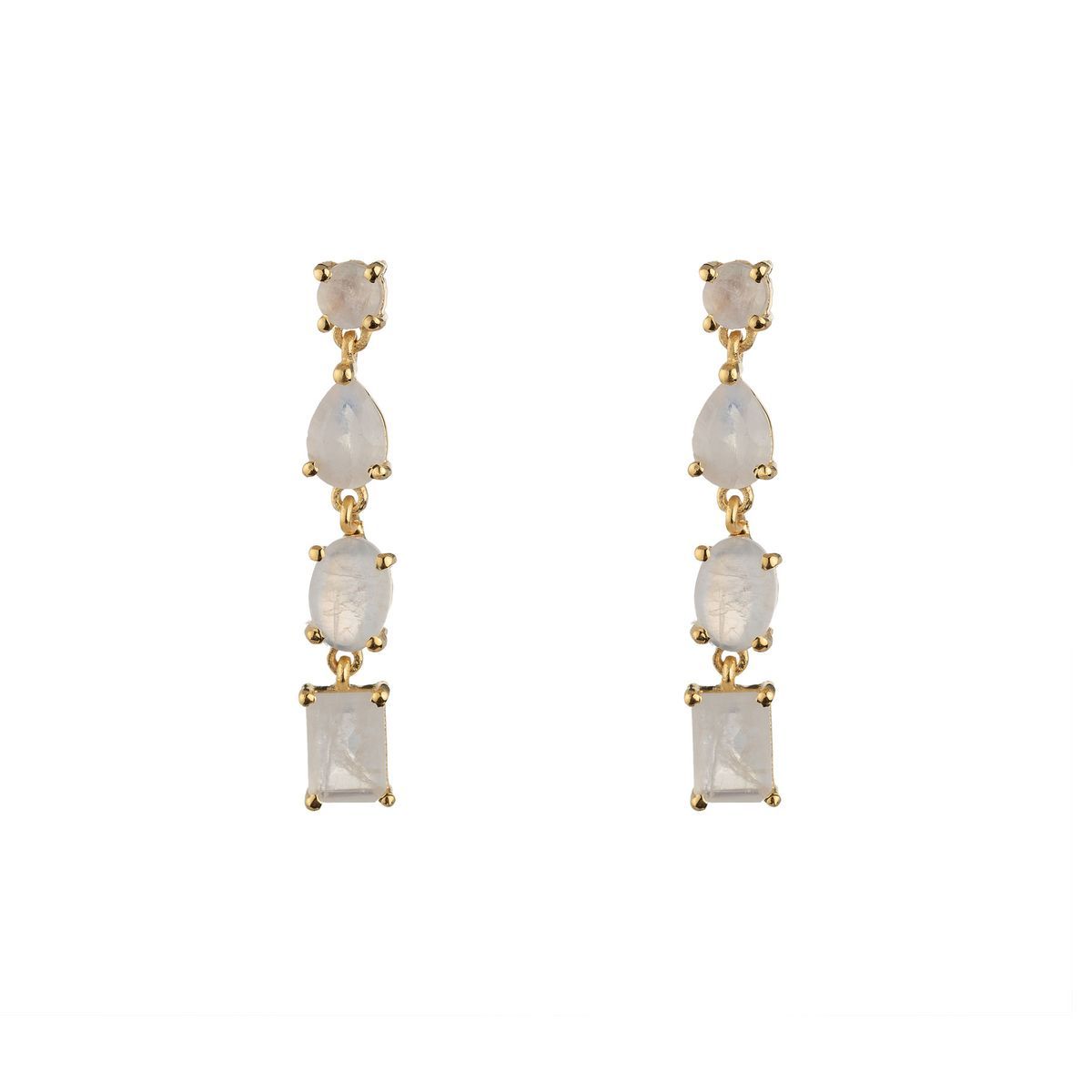 Pendientes colgantes PEM0311DOPL en metal dorado con piedras lunas de formas variadas: cuadrada, ovalada, gota y cuadrada. Diseño elegante y sofisticado, perfectos para looks formales o diarios con toque de distinción. Ideal para mujeres que buscan joyería de calidad con estilo atemporal.