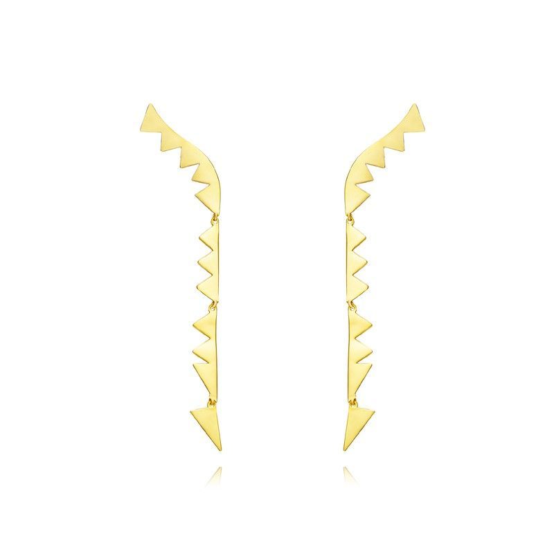 Pendientes largos en metal dorado con diseño geométrico de triángulos escalonados, ideales para looks modernos y sofisticados. Su forma curva y acabado brillante aportan elegancia y estilo. Perfectos para mujeres que buscan accesorios únicos y llamativos para complementar sus atuendos diarios o de ocasión.