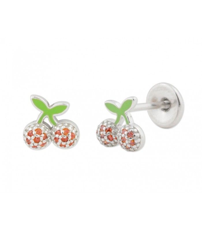 Pendientes Liska MED260A-2 en forma de cereza, con acabado plateado y detalles en circonitas naranjas. Diseño elegante y divertido con hojas verdes, perfectos para mujeres que buscan un toque de estilo y originalidad. Ideales para looks casuales o semi-formales, combinan con cualquier atuendo. Fabricados en metal de calidad, con cierre seguro para