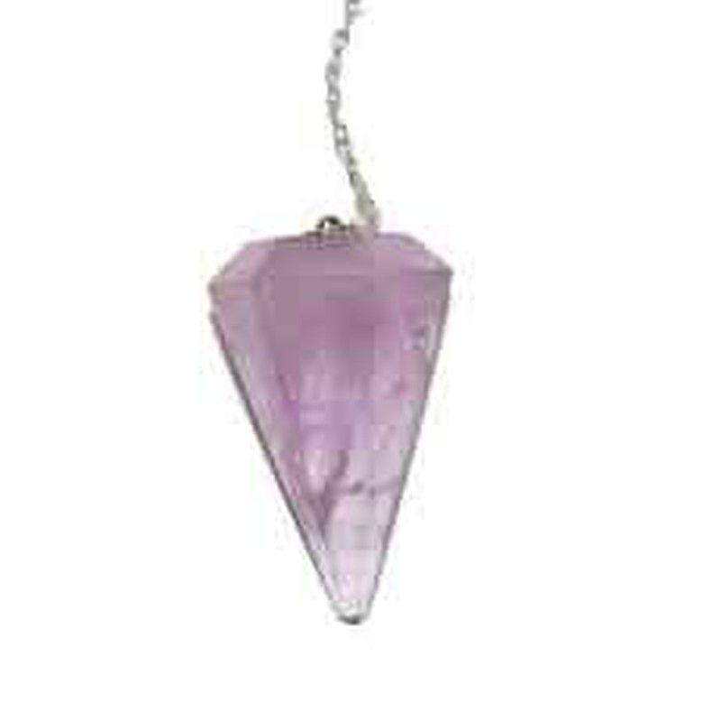 Péndulo de cuarzo amatista zen con forma de punta de diamante, ideal para meditación, equilibrio energético y decoración esotérica. Fabricado con cristal natural de tono morado claro y cadena metálica plateada. Perfecto para amantes de la energía positiva y la armonía interior.
