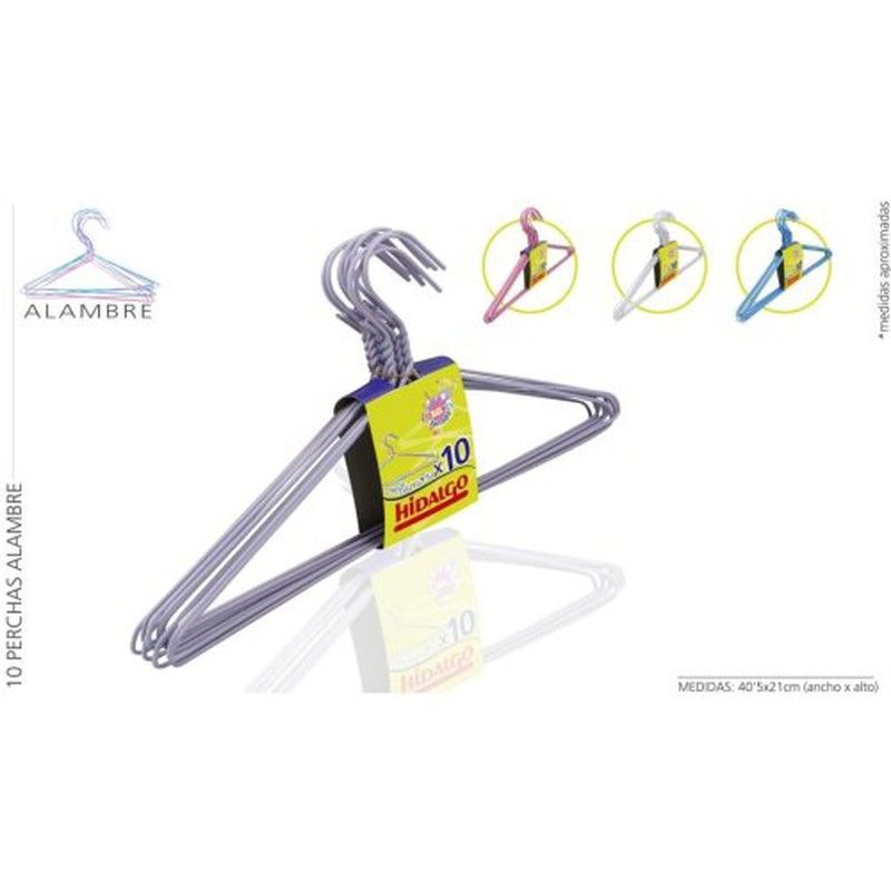 Set de 10 perchas de alambre de alta calidad, ideales para colgar ropa en armarios o percheros. Fabricadas en metal resistente con acabado gris, ofrecen durabilidad y estabilidad. Perfectas para uso diario en hogar o tienda. Incluyen etiqueta de marca Hidalgo y medidas aproximadas de 40.5 x 27 cm. Solución práctica y económica para organizar tu ves