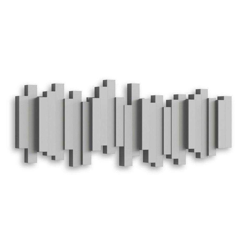 Perchero de pared con diseño de barras verticales intercaladas, estilo moderno y minimalista, acabado mate en tono gris uniforme