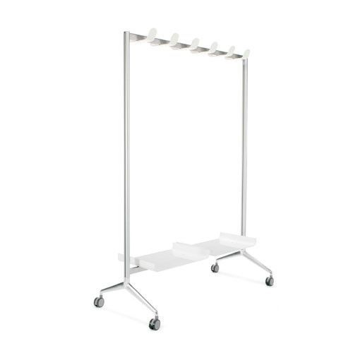 Perchero TEN para perchas con ruedas, ideal para oficinas o espacios de trabajo. Fabricado en acero inoxidable y plástico, ofrece un diseño moderno y funcional. Incluye seis ganchos y estante inferior para mayor organización. Fácil de mover gracias a sus ruedas. Perfecto para mantener el orden en vestuarios, despachos o áreas comunes.