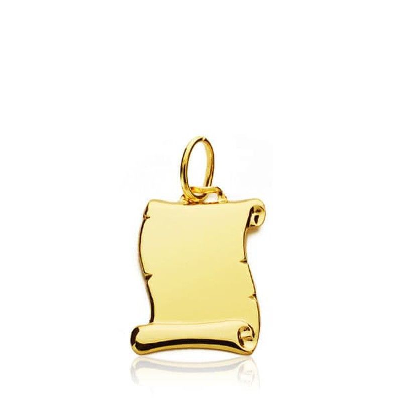 Colgante en forma de pergamino en oro 9kt, con acabado brillante y superficie lisa. Ideal para personalizar collares o pulseras. Diseño elegante y clásico, perfecto para amantes de la joyería fina. Fabricado en metal de alta calidad, con dimensiones de 15x11mm. Un accesorio versátil y sofisticado para cualquier ocasión.