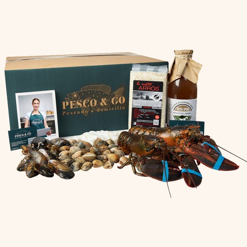 PESCO&GO Box: Arroz con Bogavante, una experiencia gourmet en casa. Incluye bogavante fresco, mejillones, almejas, arroz y salsa especial. Ideal para amantes del marisco que buscan calidad y sabor. Preparado con ingredientes seleccionados, perfecto para una cena elegante y fácil de cocinar. Envío directo a domicilio.