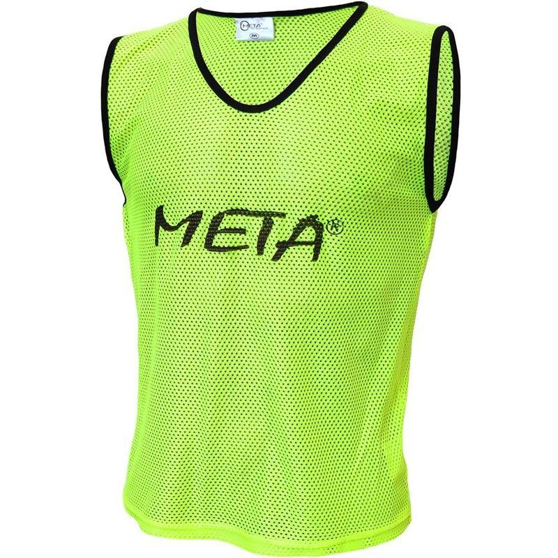 Peto deportivo verde fluorescente de talla XL, ideal para entrenamientos de fútbol y atletismo. Fabricado en poliéster transpirable con diseño de malla para mayor comodidad. Cuello en V con ribete negro y logotipo 'META' en el pecho. Perfecto para equipos, partidos de entrenamiento o actividades grupales. Alta visibilidad y durabilidad.
