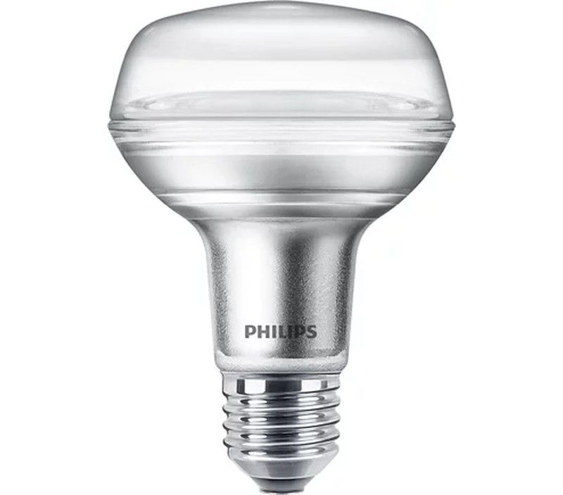 Bombilla LED Philips CorePro LED R80 de 827 (luz cálida) con ángulo de haz de 36º, ideal para iluminación interior. Diseño moderno con cuerpo transparente y base metálica plateada. Reemplaza bombillas de hasta 100W, ahorra energía y ofrece una luz cálida y acogedora. Perfecta para lámparas de techo, apliques o focos en salones, cocinas y dormitorio