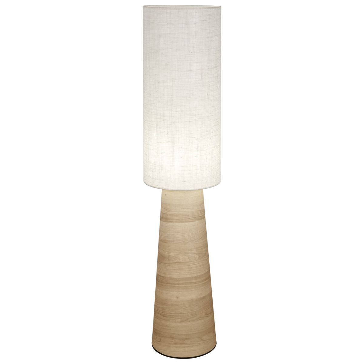 Lámpara de pie Aosta con base de madera en tono beige y pantalla cilíndrica de lino blanco. Diseño elegante y minimalista ideal para salones, dormitorios o rincones de lectura. Ofrece una luz cálida y ambiental, perfecta para crear espacios acogedores. Fácil de integrar en decoraciones modernas o escandinavas.