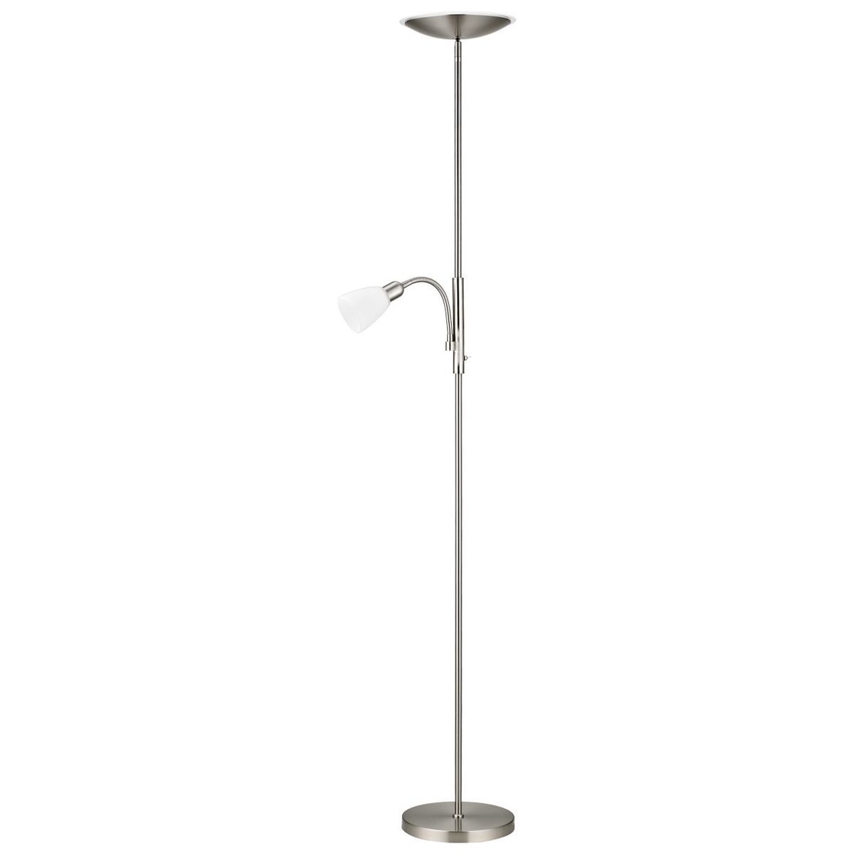 Lámpara de pie Atos en acabado níquel satinado, ideal para salones y espacios modernos. Con luz LED de 18W y 4000K para un brillo cálido y eficiente, más un foco E-14 de 40W. Estructura en acero inoxidable y pantalla de vidrio opalino. Diseño elegante y funcional con brazo ajustable para iluminar con precisión. Perfecta para crear ambientes acogedo
