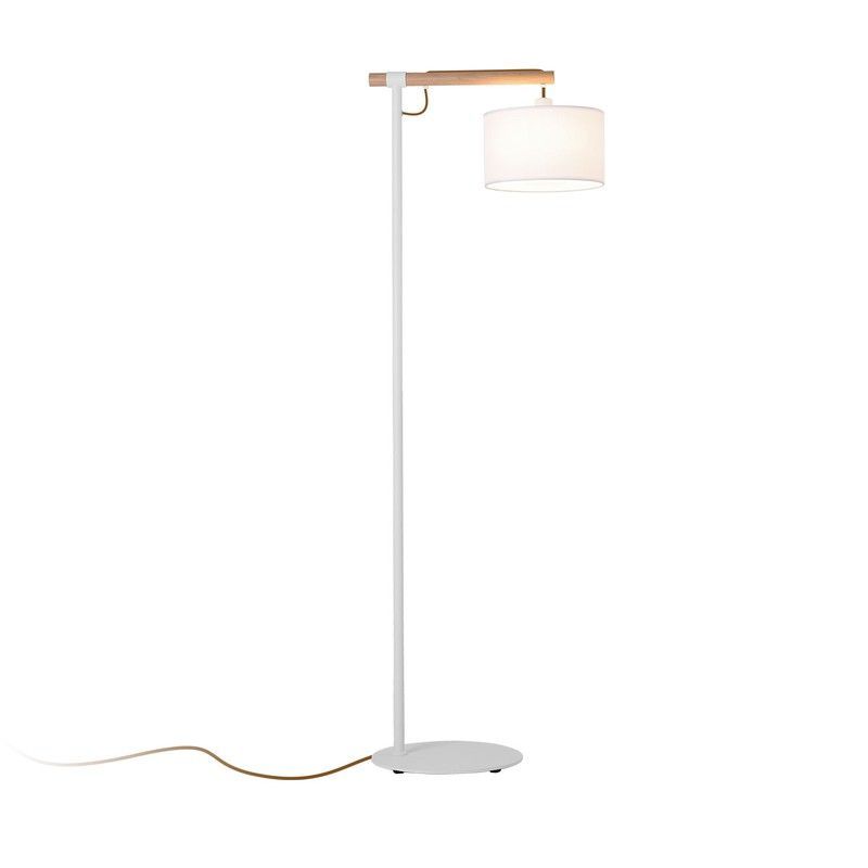 Lámpara de pie Lumiere ML2117-WH con diseño moderno y minimalista, ideal para salón o dormitorio. Estructura metálica blanca con base circular y soporte de madera clara. Pantalla cilíndrica de tela blanca que difumina la luz suavemente. Cable de alimentación en tono marrón claro. Aporta estilo y funcionalidad a cualquier espacio con un toque de ele