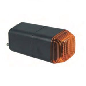 Piloto lateral rectangular con carcasa negra y lente naranja con ranuras verticalesConector metálico en uno de los extremosDiseño compacto para montaje en vehículos