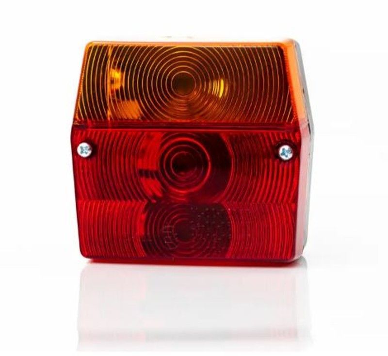 Piloto de remolque izquierdo con bajonete de 4 funciones, ideal para vehículos motorizados. Fabricado en plástico resistente, cuenta con lentes rojas y naranjas con patrón circular para mayor visibilidad. Diseño compacto y seguro, con fijación mediante tornillos metálicos. Perfecto para mejorar la seguridad en carretera.