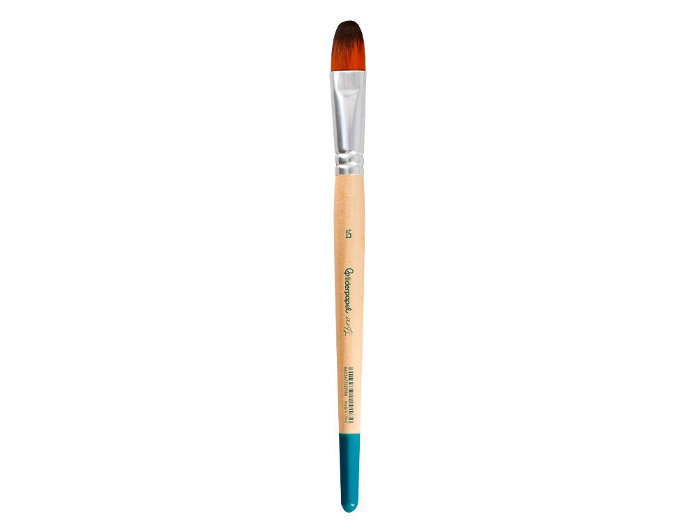 Pincel líderpapel n°15 con punta filbert (lengua de gato) ideal para pintura acrílica y acuarela. Fabricado con pelo sintético certificado, mango de madera y acabado metálico. Perfecto para artistas y aficionados que buscan precisión y control en sus trazos. Ideal para técnicas mixtas y detalles suaves.