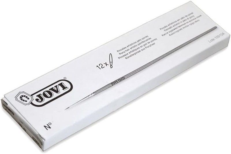 Caja de 12 pinceles artísticos punta redonda nº 10 de la marca JOVI, ideales para pintura y manualidades. Con mango ergonómico y cerdas de alta calidad, perfectos para artistas y aficionados. Incluye embalaje blanco con detalles en negro y texto multilingüe. Ideal para proyectos creativos en casa o taller.