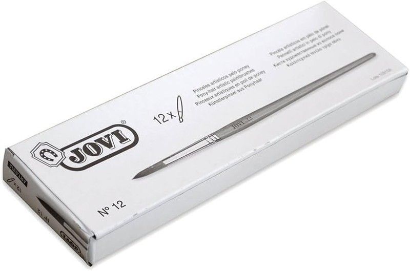 Caja de 12 pinceles artísticos JOVI con punta redonda nº 12, ideales para pintura fina y detalles precisos. Con mango metálico resistente y cerdas de alta calidad, perfectos para artistas y aficionados a las manualidades. Incluye embalaje blanco con diseño limpio y profesional.