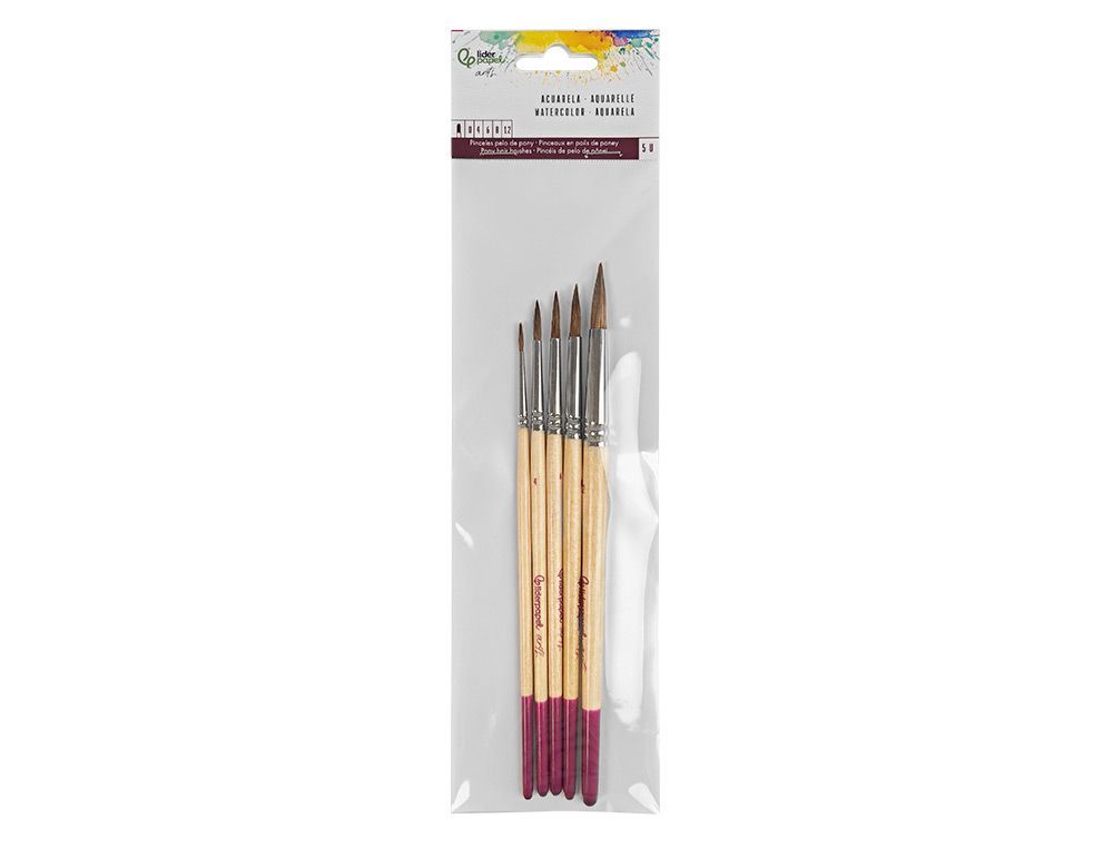 Juego de 5 pinceles de pelo de pony con mango de madera y virola cromada, ideales para pintura y manualidades. Calidad certificada FSC, con tamaños surtidos para precisión y versatilidad. Perfectos para artistas y aficionados al arte.