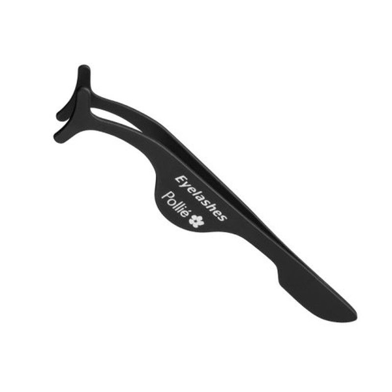 Pinza para pestañas postizas con diseño ergonómico, extremo en forma de gancho para facilitar el agarre, texto impreso 'eyelashes polite' con un pequeño símbolo de flor