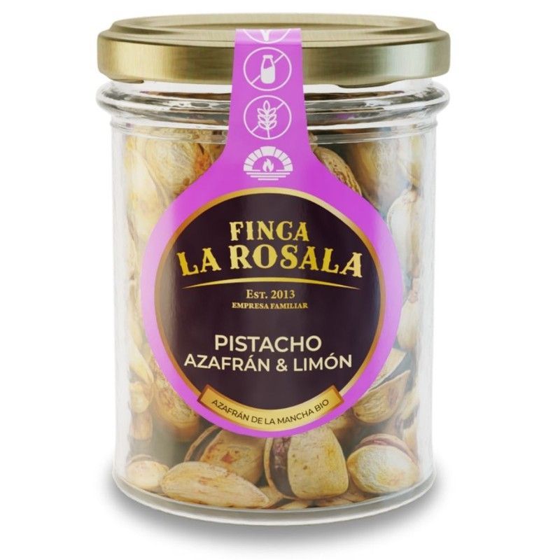 Pistachos con azafrán y limón de Finca La Rosala, en tarro de 90 grs. Frutos secos gourmet con toque aromático y natural, elaborados con azafrán de la Mancha Bio. Ideal como snack saludable, regalo gourmet o acompañamiento de vinos. Sin gluten, sin lactosa y apto para veganos. Un sabor único y sofisticado para disfrutar en cualquier momento.