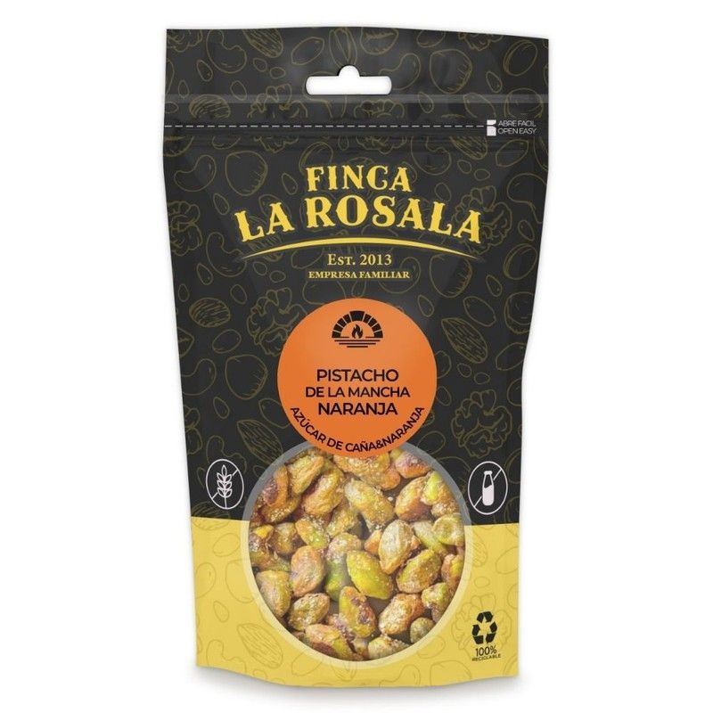 Pistachos de la Mancha con naranja de Finca La Rosala, en bolsa de 80 gramos. Frutos secos naturales con azúcar de caña, sin gluten ni aditivos. Ideal para disfrutar como snack saludable y sabroso en cualquier momento del día. Producto de empresa familiar desde 2013.