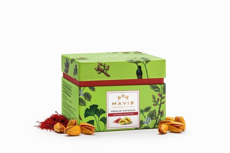 Caja de pistachos iraníes al azafrán de 100 grs de la marca Mavis, presentados en una elegante caja verde con diseño de hojas y detalles naturales. Ideal para amantes de frutos secos gourmet, con un toque exquisito de azafrán que realza su sabor. Perfecto como regalo o para disfrutar en cualquier momento del día.