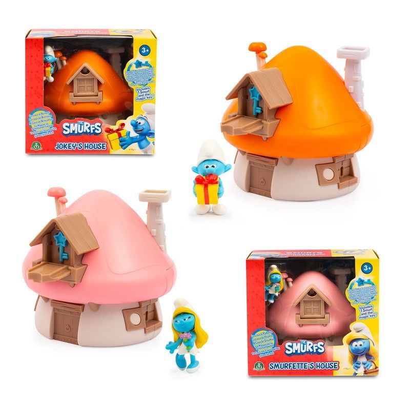 Juego de construcción Pitufos Magic Key Playset con casas de seta en naranja y rosa, incluye figuras de Jockey y Smurfette. Ideal para niños de 3 años en adelante. Hecho de plástico resistente, perfecto para juegos imaginativos y desarrollo motor. Incluye caja de presentación con ventana transparente para ver el contenido.