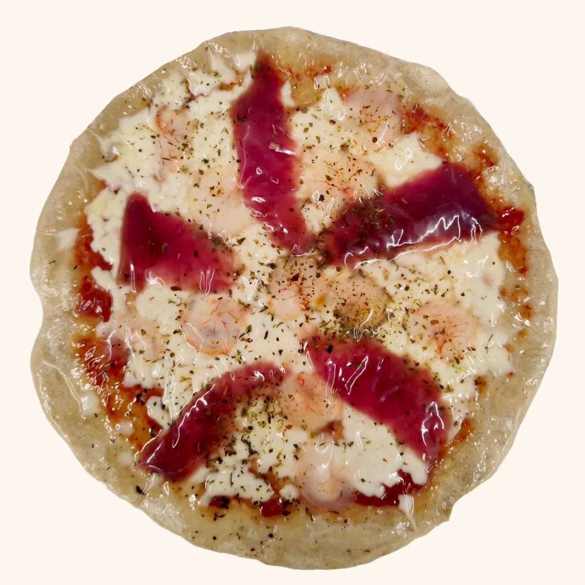 Pizza artesanal de atún y gamba, ideal para amantes de la comida gourmet y sabores del mar. Con base de masa fina y dorada, cubierta con queso blanco cremoso, trozos de atún y gambas frescas, y salsa roja en rayas. Espolvoreada con hierbas y especias para un toque gourmet. Perfecta para disfrutar en casa o compartir con amigos.