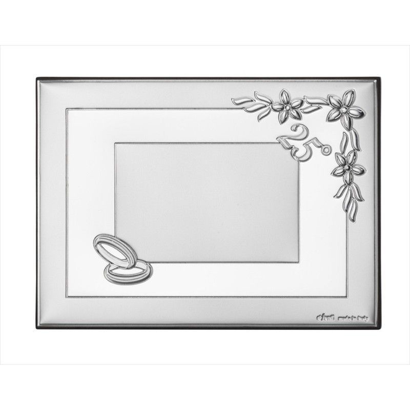 Marco conmemorativo de 13x18 cm en metal plateado, ideal para celebrar 25 años de matrimonio. Diseño elegante con flores, hojas y alianzas grabadas. Perfecto para enmarcar una foto especial y conmemorar el aniversario de bodas con estilo y significado. Ideal para regalar a parejas que celebran su cuarto de siglo juntos.