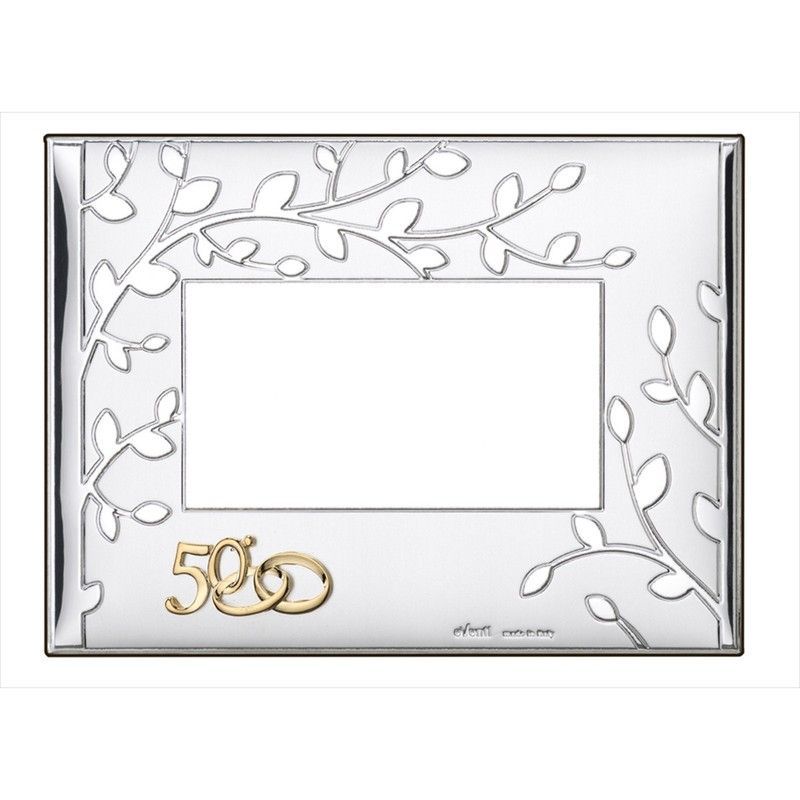 Elegante marco conmemorativo de 13x18 cm para celebrar 50 años de matrimonio. Fabricado en metal con acabado plateado y detalles dorados, incluye diseño de ramas y hojas grabadas y el símbolo '50' con anillos entrelazados. Ideal para regalar en bodas de oro, con un toque sofisticado y duradero.