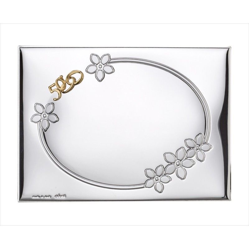 Placa conmemorativa de 13x18 cm con diseño elegante en acero inoxidable, ideal para celebrar 50 años de matrimonio. Decorada con flores estilizadas en relieve y detalles dorados con la inscripción '50' en forma de anillos entrelazados. Perfecta para regalar a parejas que celebran su aniversario de oro, combinando calidad y simbolismo. Ideal para ex