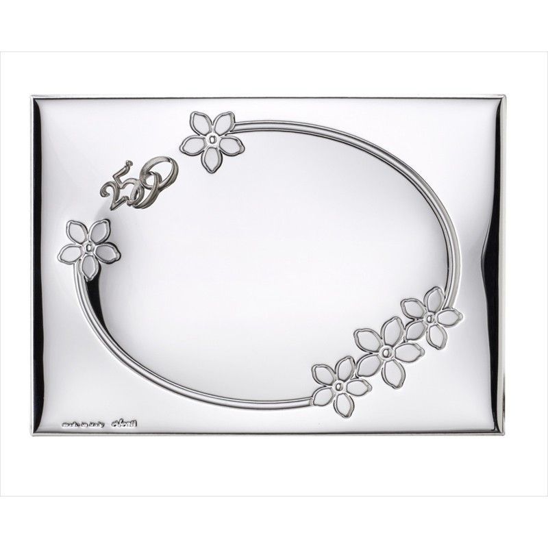 Placa conmemorativa de 13x18 cm en acero inoxidable con acabado plateado, ideal para celebrar 25 años de matrimonio. Diseño elegante con marco ovalado decorado con flores y el número '25' en relieve. Perfecta para regalar a parejas en su aniversario de plata. Incluye inscripción 'Alianzas Flores 25 Años'.