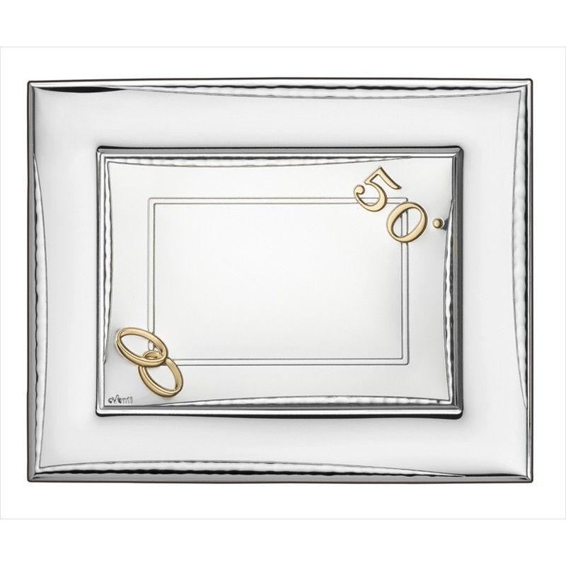 Marco conmemorativo para foto de 13x18 cm, ideal para celebrar 50 años de matrimonio. Fabricado en metal plateado con detalles dorados y diseño elegante con anillos entrelazados y el número '50'. Perfecto para regalar a parejas en su aniversario de oro. Incluye espacio para insertar una foto con estilo clásico y sofisticado.