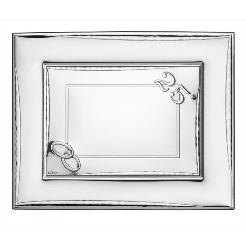 Placa portafotos conmemorativa de 13x18 cm en acero inoxidable, ideal para celebrar 25 años de matrimonio. Diseño elegante con detalles de anillos entrelazados y corazón, acabado plateado brillante. Perfecta para regalar o decorar el hogar con un toque romántico y duradero.