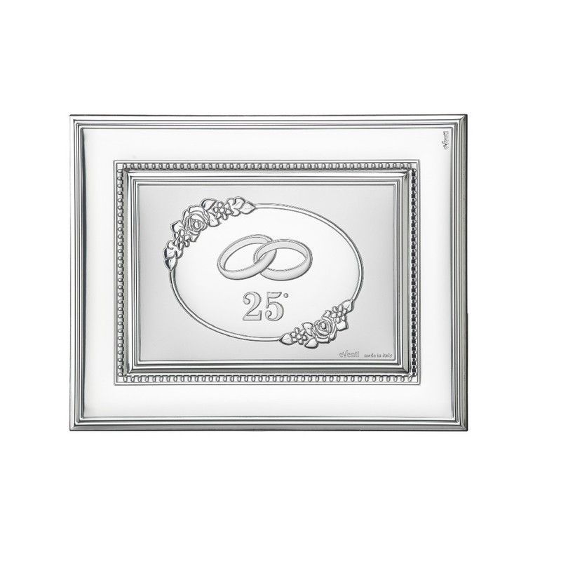 Placa conmemorativa de 9x13 cm para celebrar 25 años de matrimonio, fabricada en metal plateado con acabado brillante. Diseño elegante con dos anillos entrelazados y detalles florales, ideal para regalar en bodas de plata. Perfecta para decorar el hogar o como recuerdo especial.
