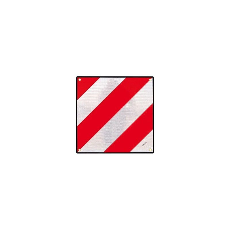 Placa V20 ABS para señalización de carga saliente, ideal para vehículos con portabicicletas o carga exterior. Fabricada en plástico resistente con acabado reflectante para mayor visibilidad. Diseño con franjas diagonales rojas y blancas que cumplen con normativas de seguridad vial. Fácil instalación gracias a los orificios en las esquinas. Protege